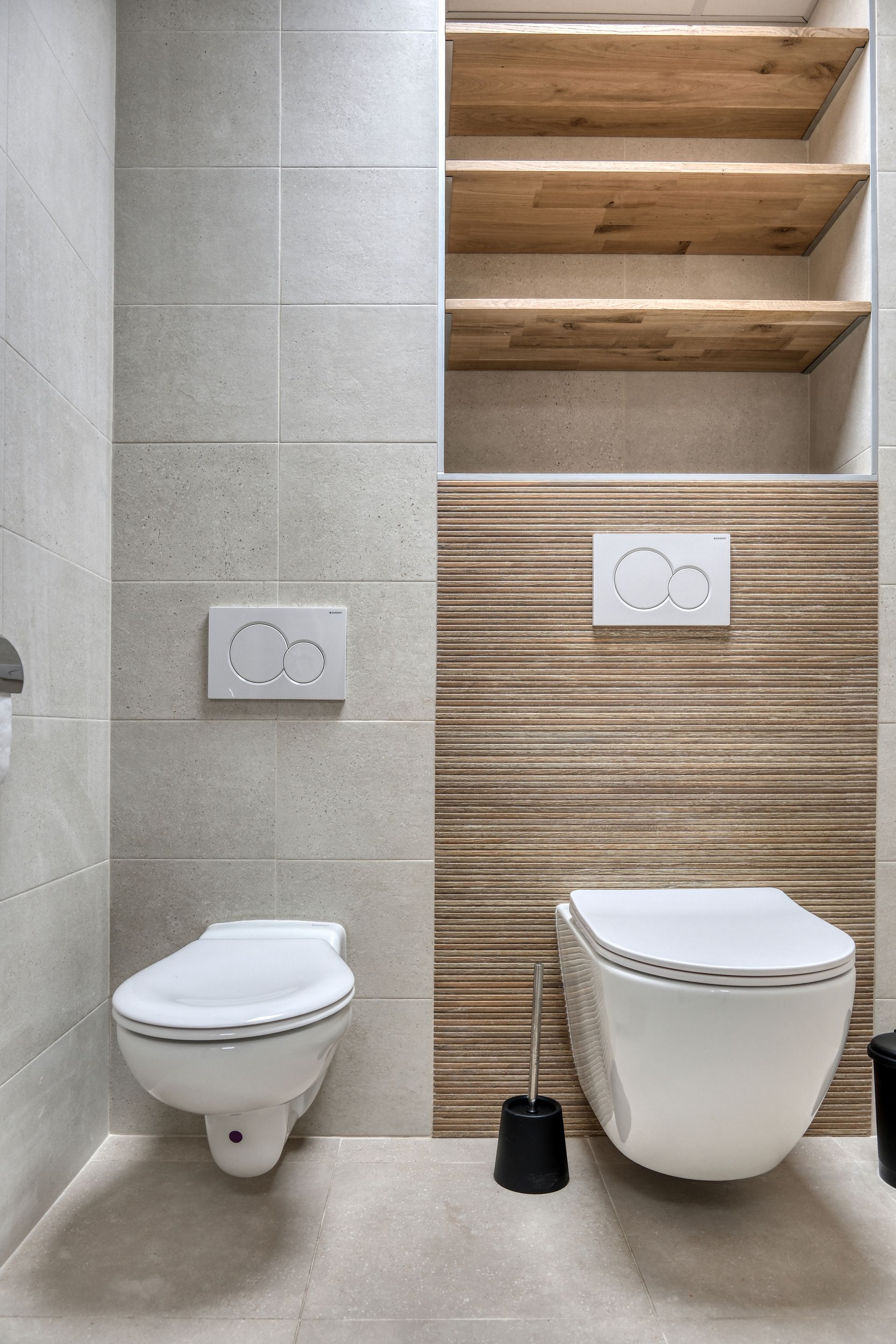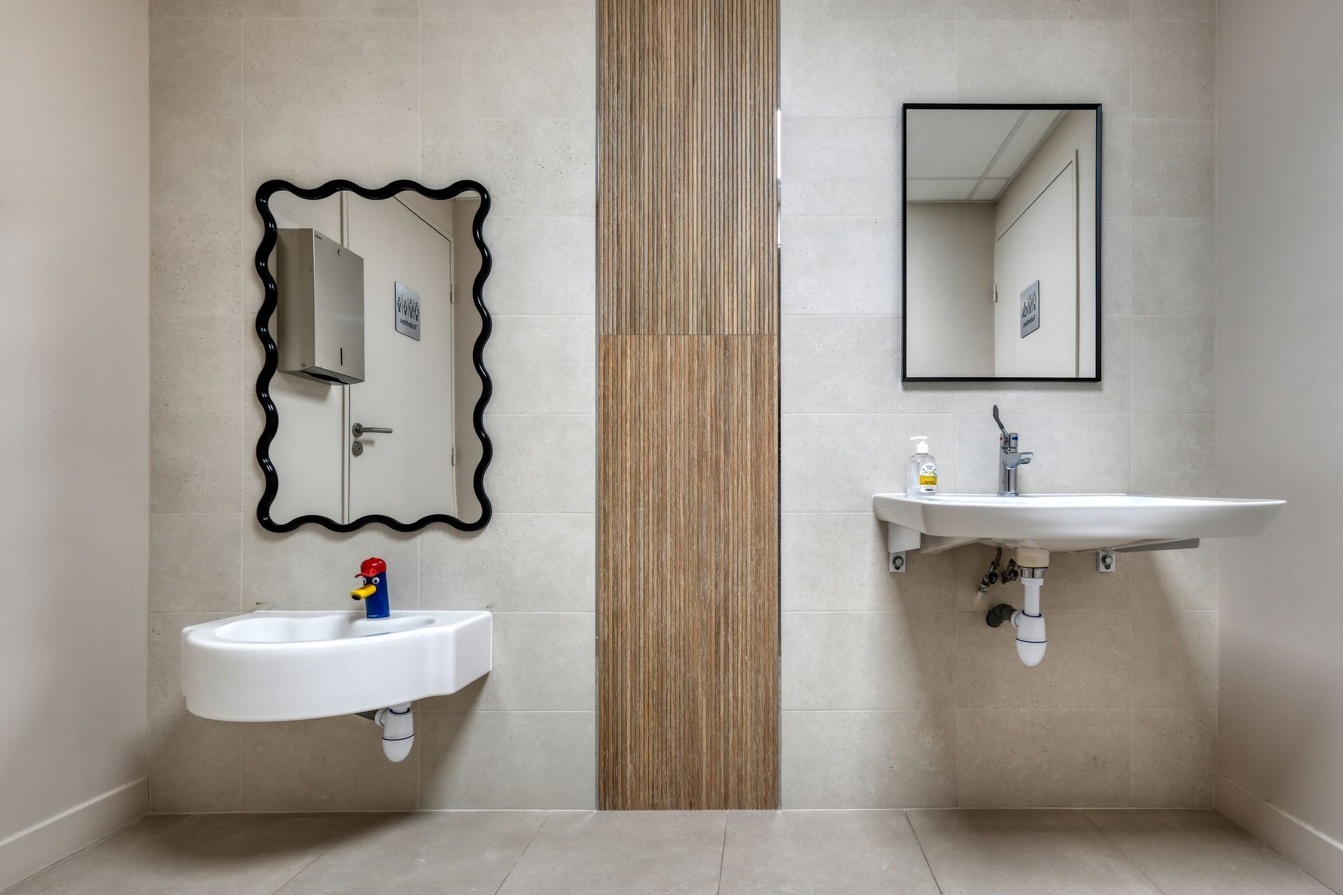 - Même les toilettes ont trouvé leur fonctionnalité PMR, avec un espace adapté aux tout-petits, dans des tons doux et chaleureux, pour préserver une continuité dans l’ambiance générale
